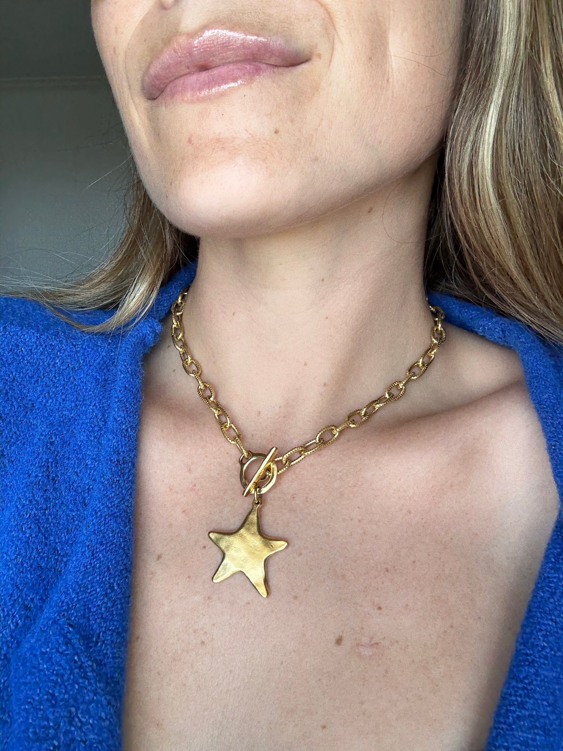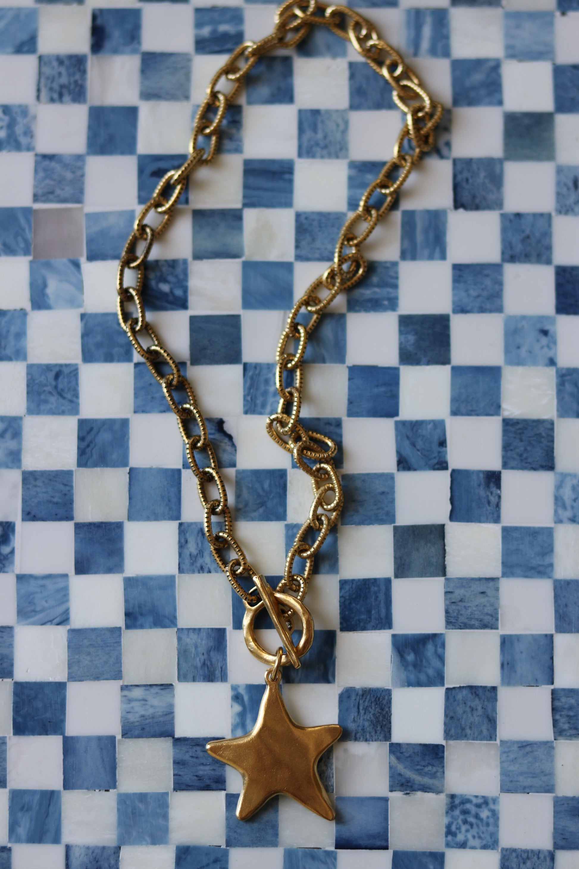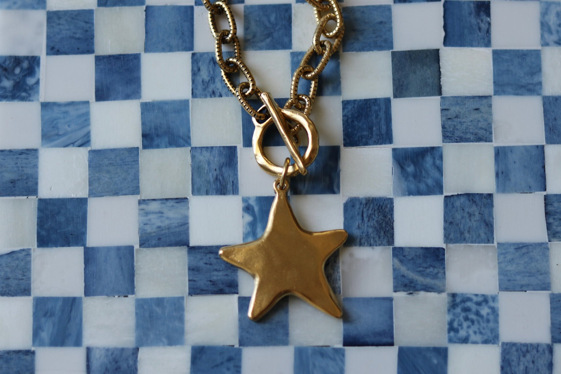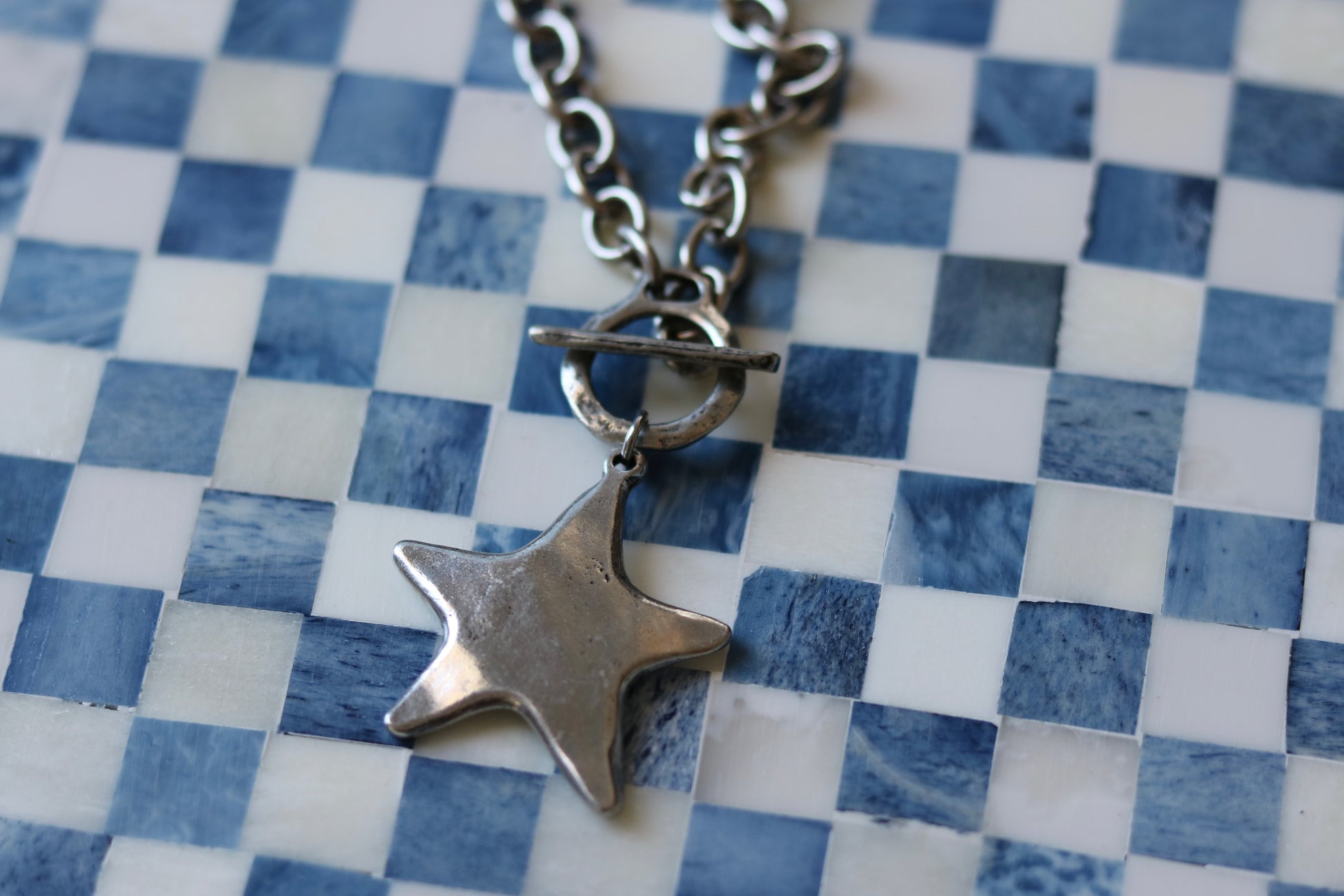 Gold or silver star charm pendant strung on a 16.5" chunky gold or silver chain. Toggle clasp.
