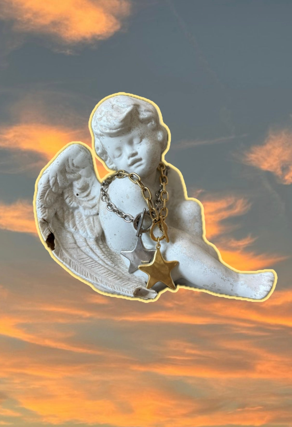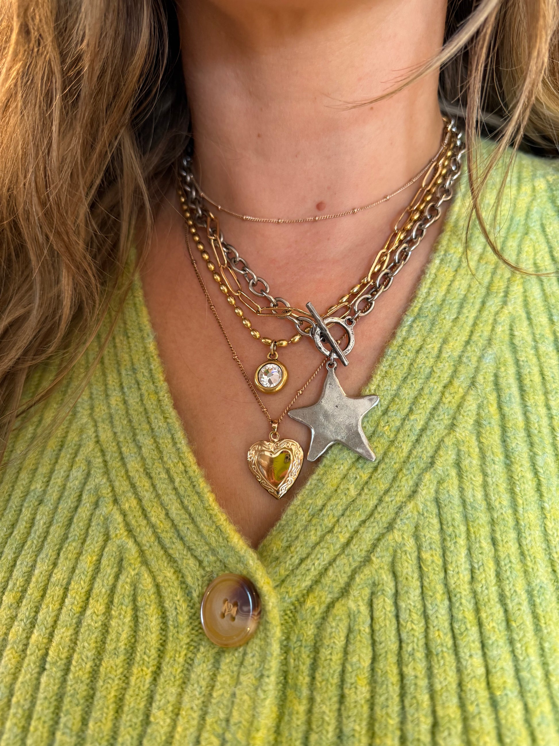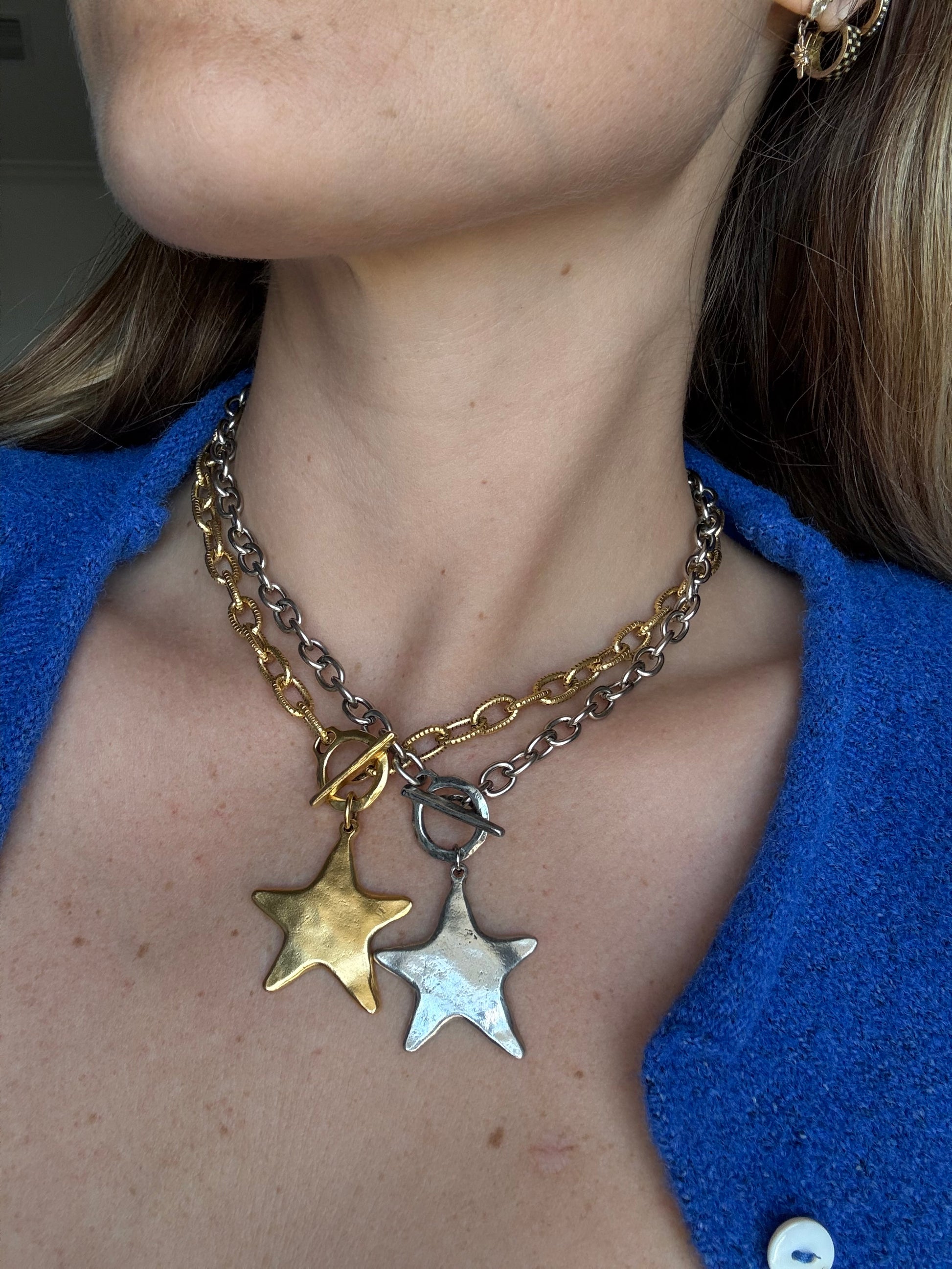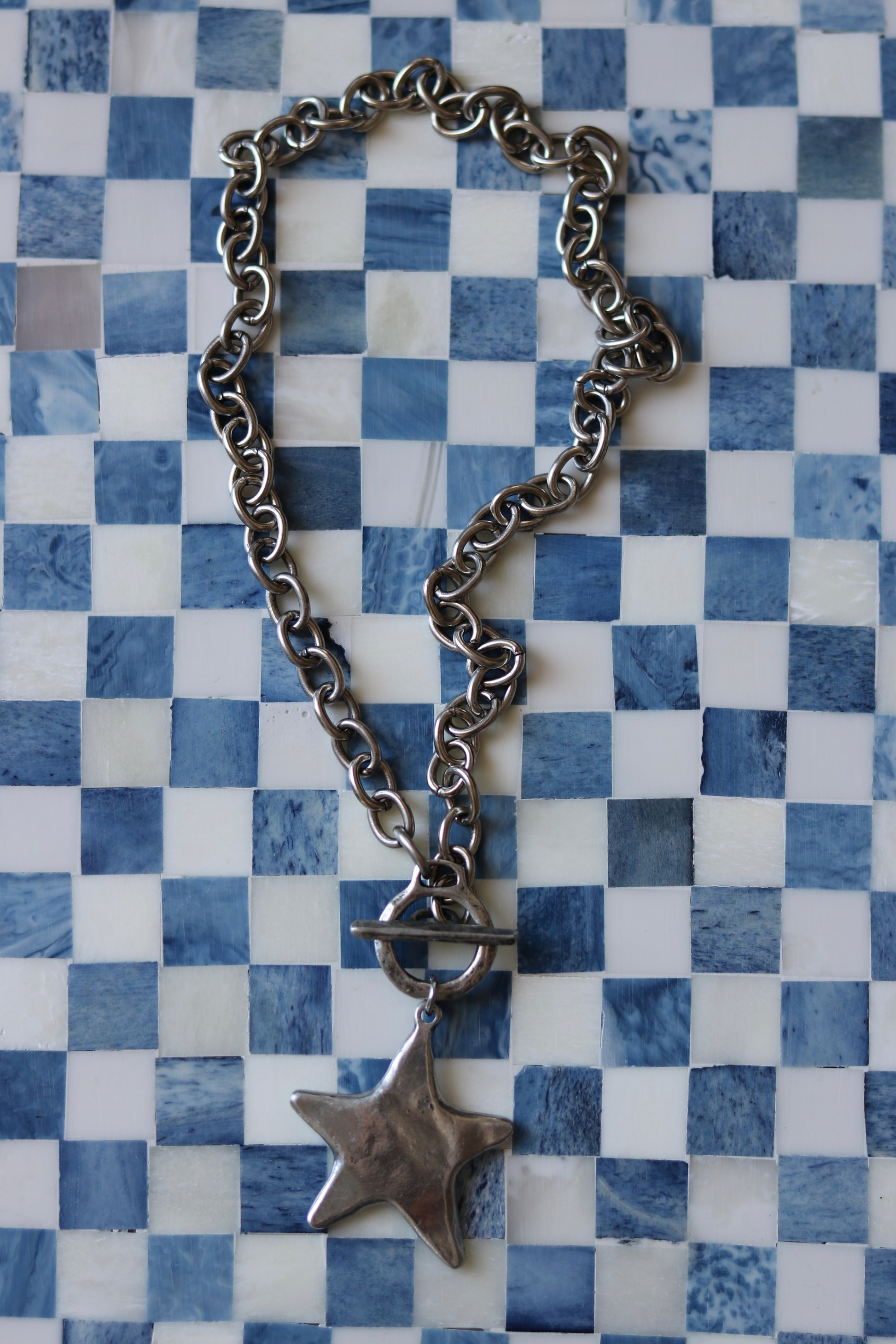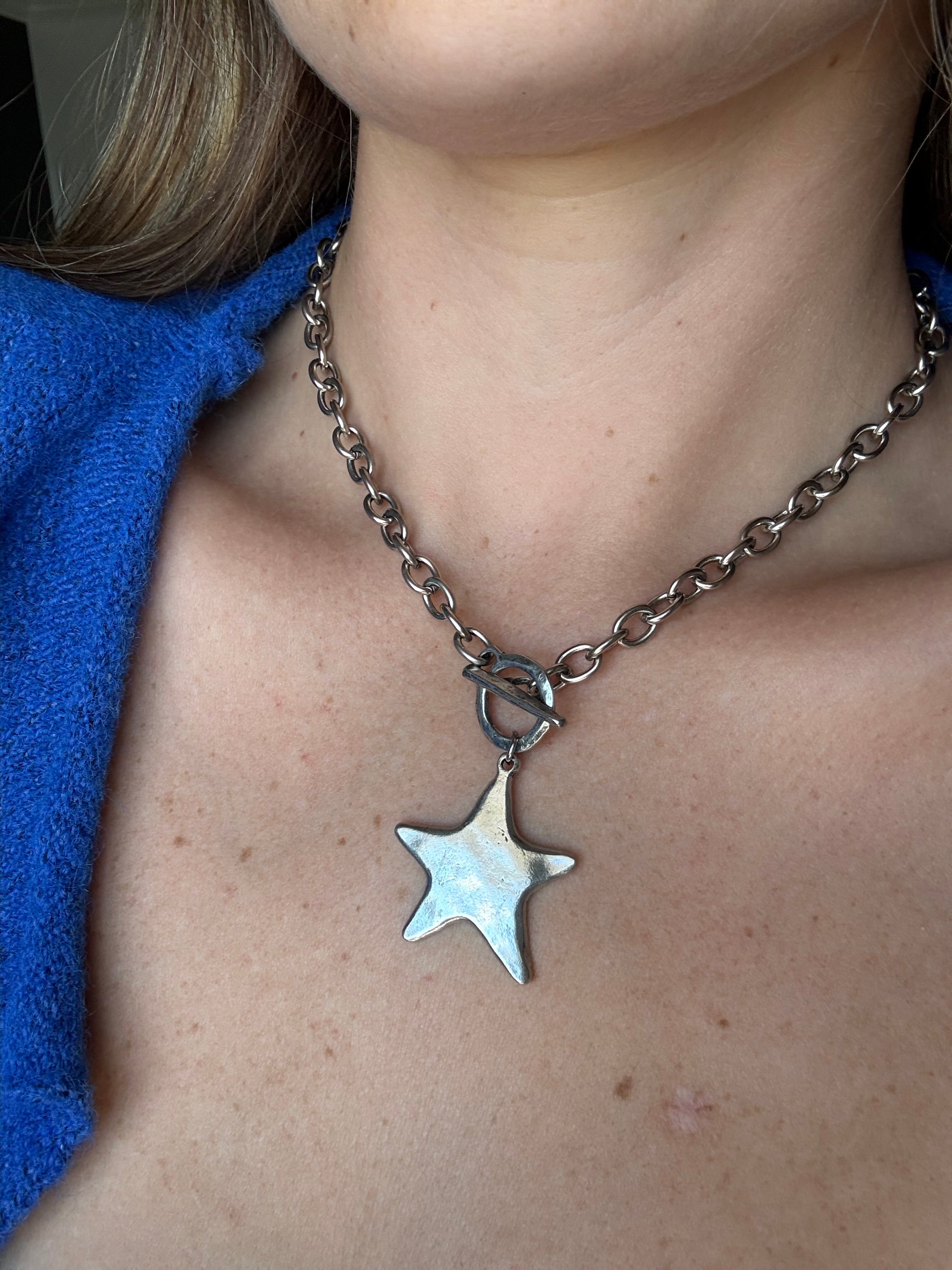 Gold or silver star charm pendant strung on a 16.5" chunky gold or silver chain. Toggle clasp.