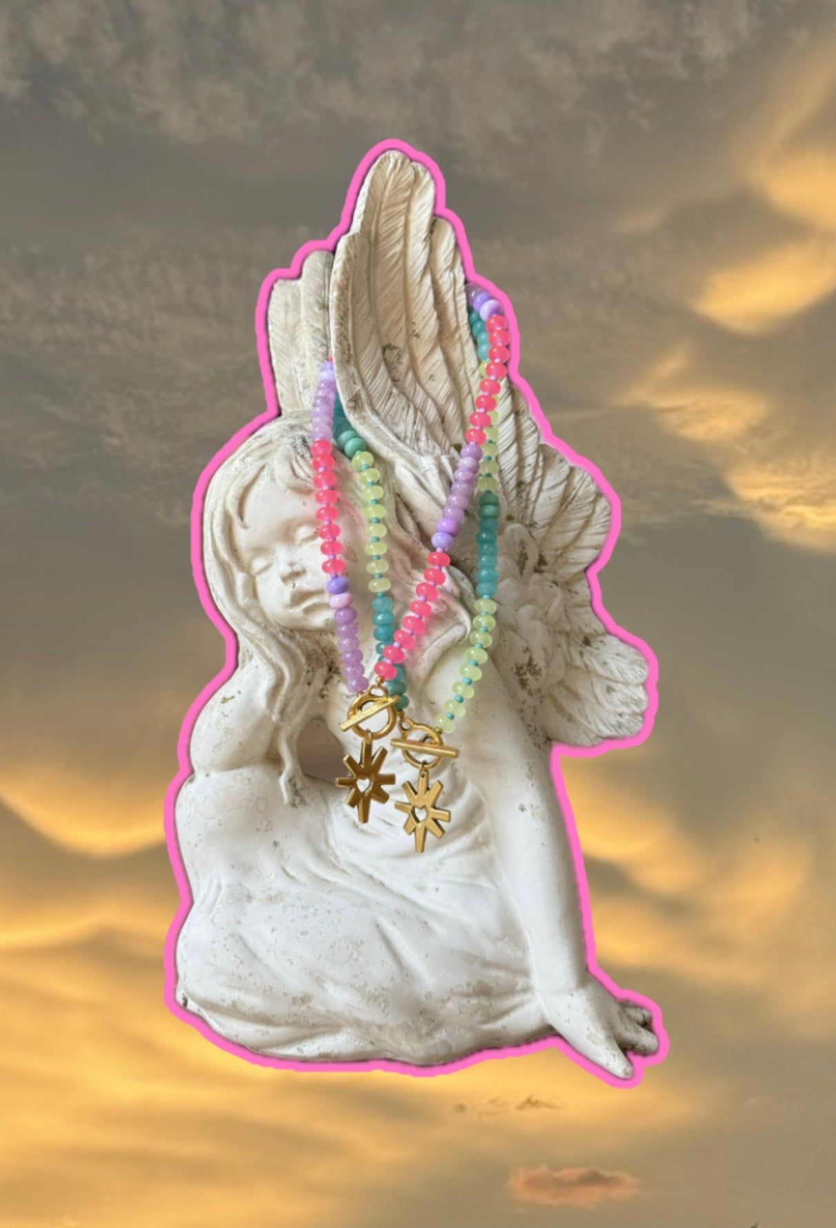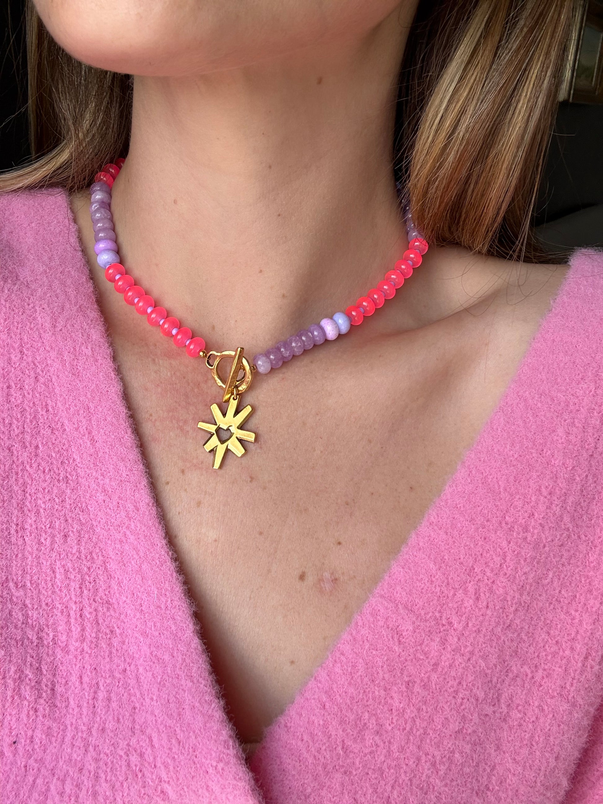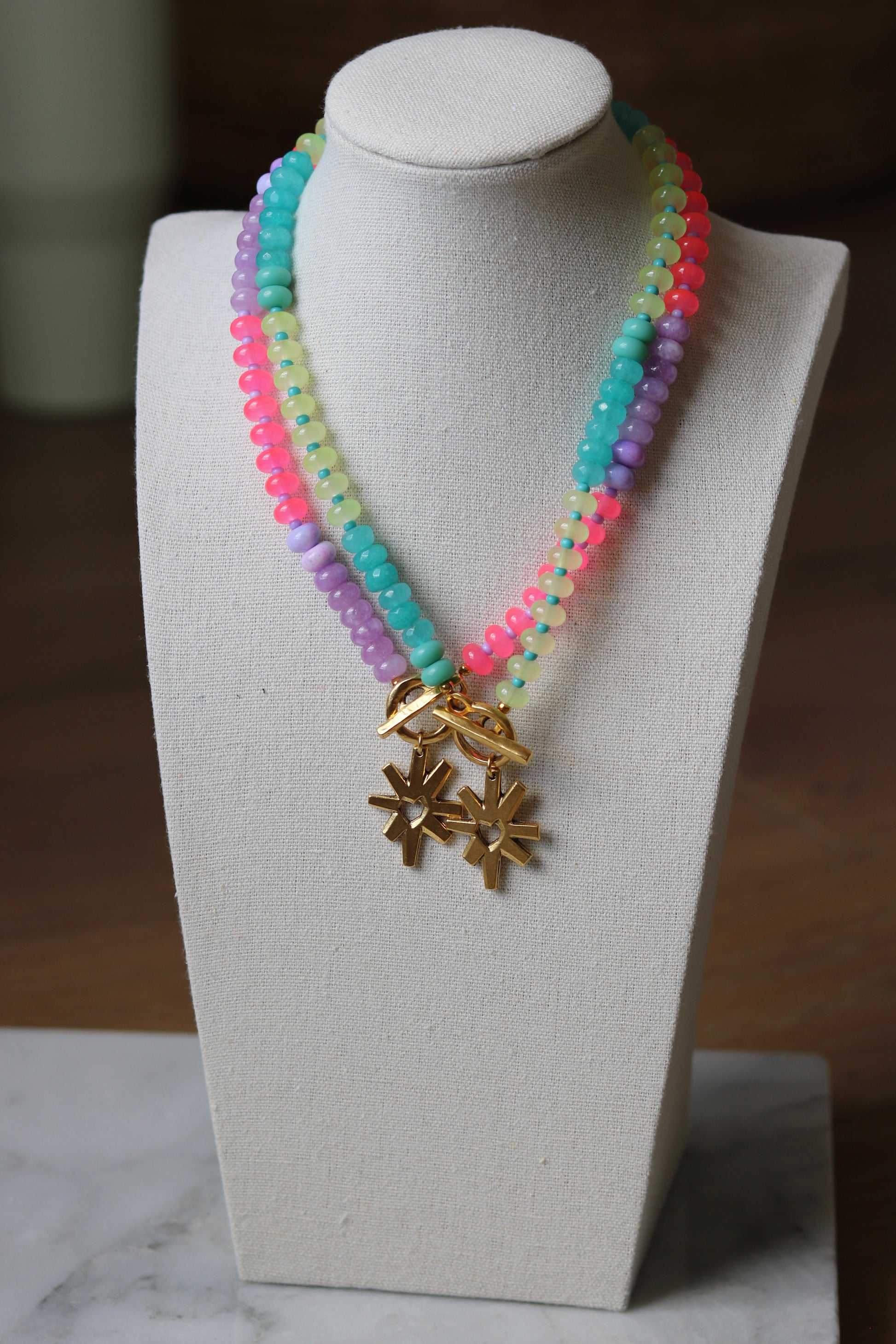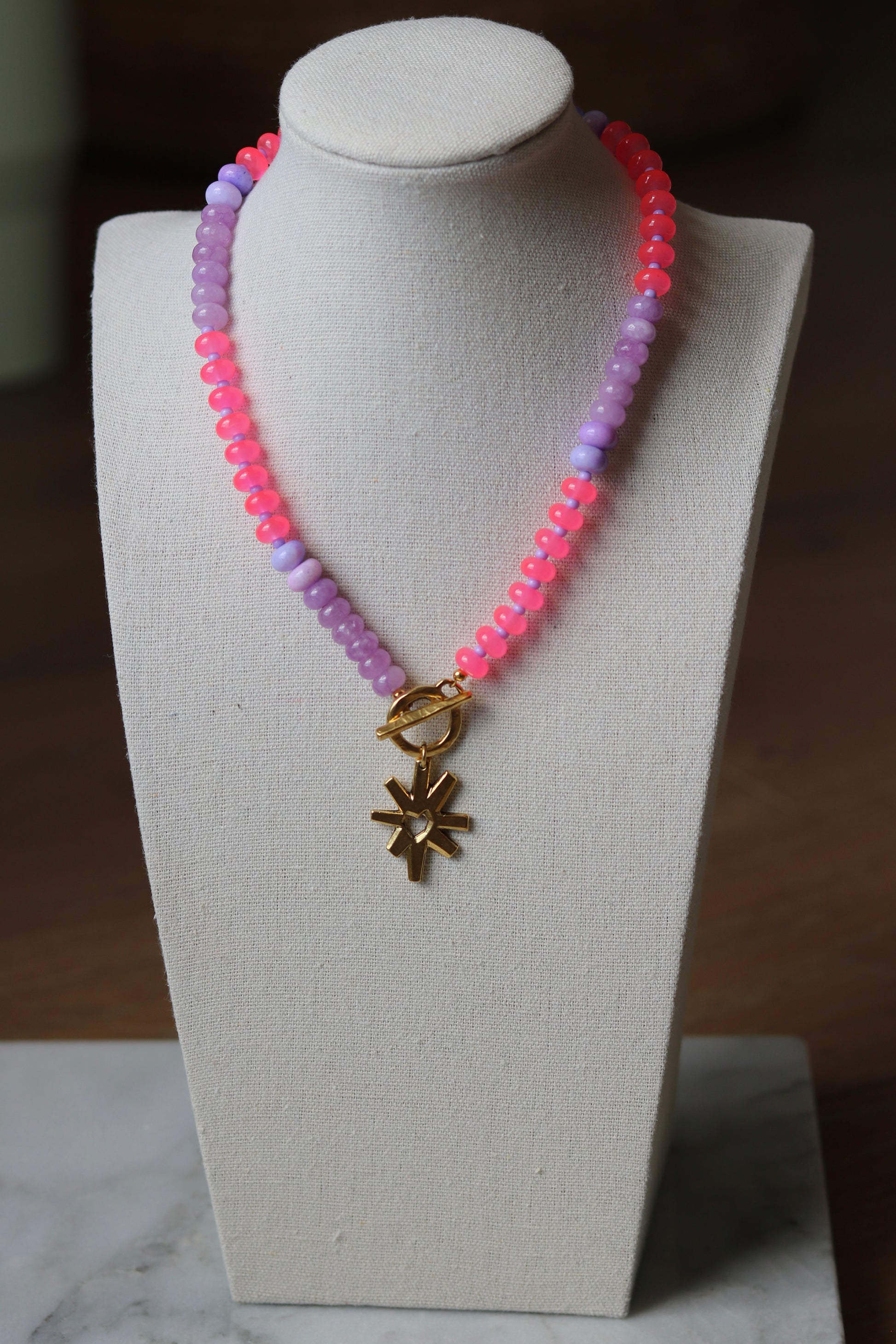 Bright neon beads(I mean they practically GLOW) strung in a color black pattern. A fun gold starburst heart pendant charm strung from a gold toggle clasp. 16"